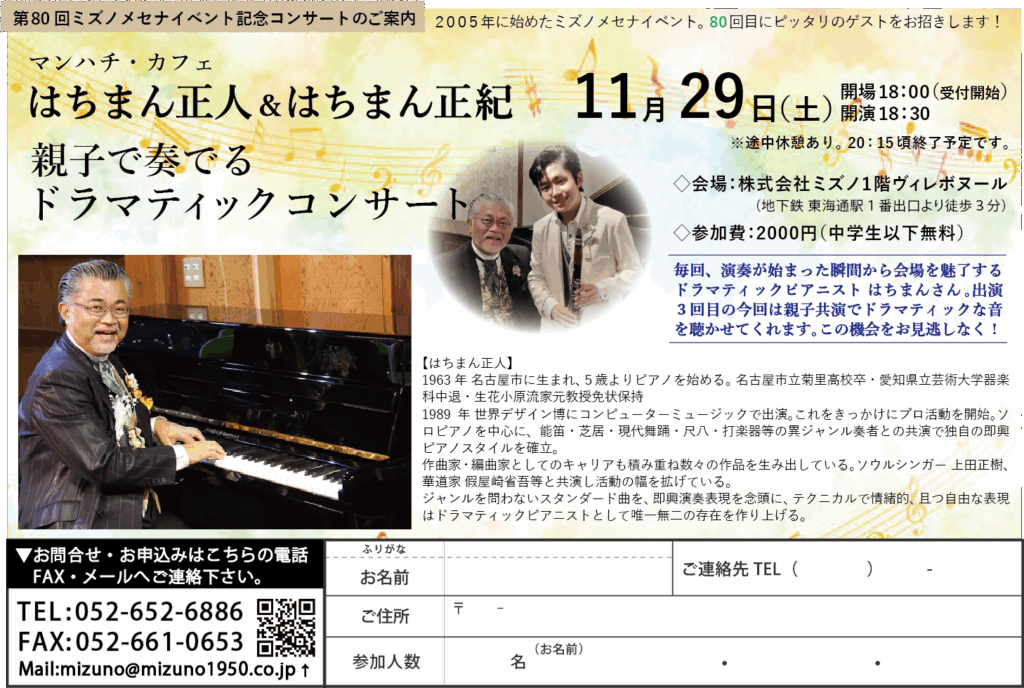 “80”回記念にピッタリの方、ミズノメセナイベントへの出演は8年ぶり3回目の、ドラマティックピアニスト はちまん正人さんをお招きします。今回はなんと!息子さんとの共演です。