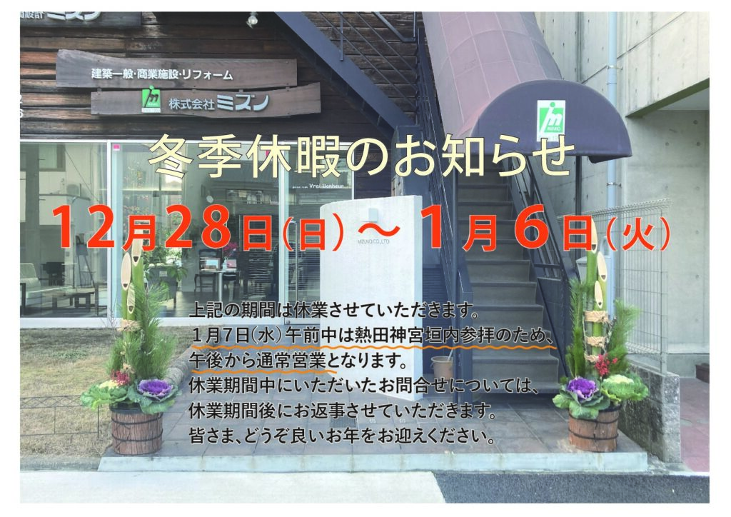 NEW 2025年12月27日 冬期休暇のお知らせ ニュース 今年一年ありがとうございました。引き続き来年も、よろしくお願いいたします。 株式会社ミズノ TEL052-652-6886 FAX052-661-0653 メールmizuno@mizuno1950.co.jp 今後も、地域の皆様やご縁のあった皆様へ、旬の情報や様々な文化発信をして行きますので、 “旬感だより”“ホームページ”をお見逃しなく!
