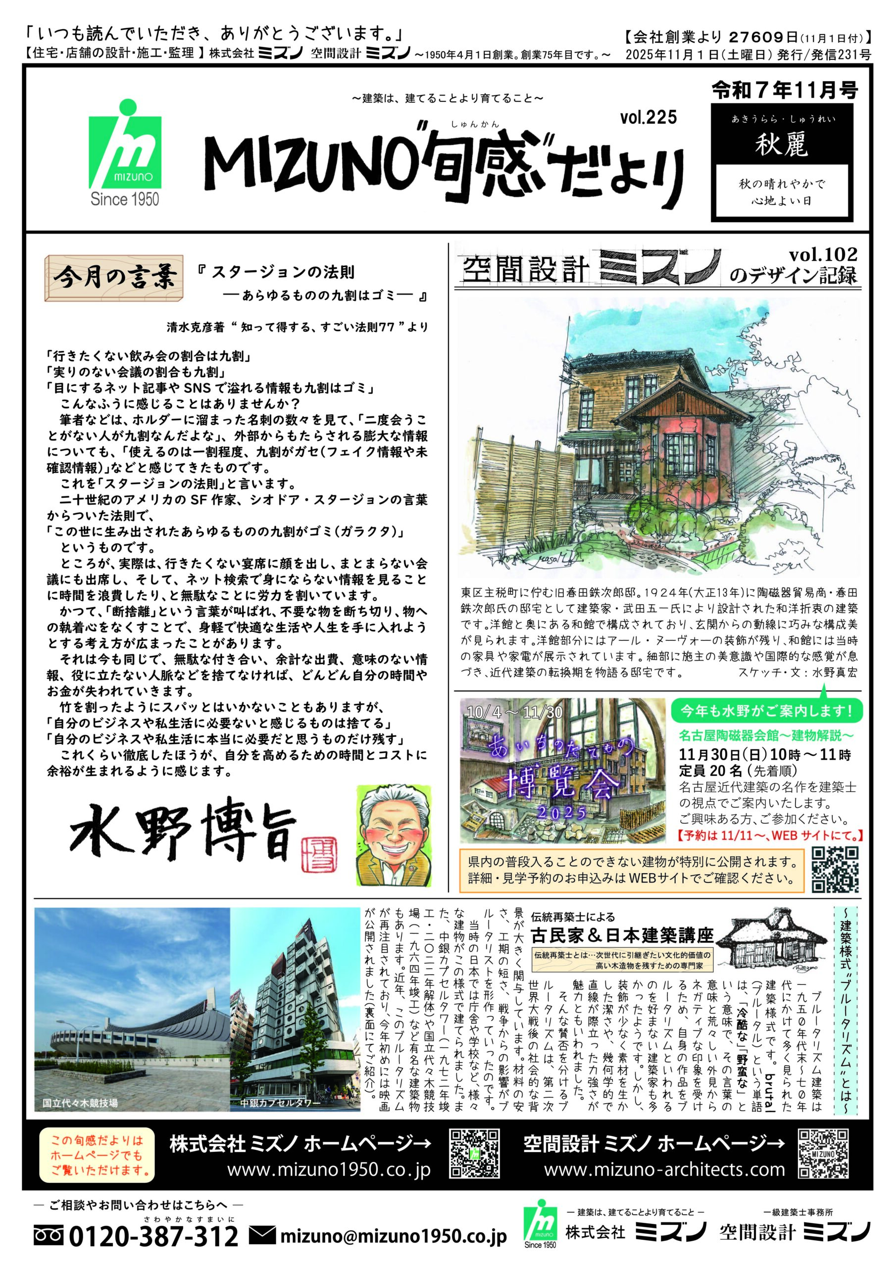 皆様に豊かな毎⽇を過ごしていただくために、創業からの感謝の気持ちをこめてオリジナル⽡版「MIZUNO 旬感だより」を毎⽉発⾏しています。建築に関することだけでなく暮らしのヒントから⼼に響く話まで幅広い情報を発信しています。毎⽉の楽しみの⼀つとして読んでいただけますと幸いです。